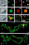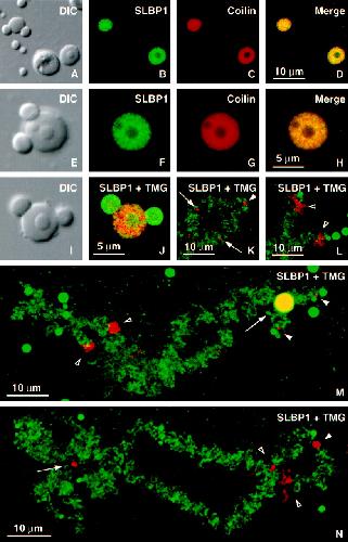 Fig. 2. Localization of SLBP1 in theXenopus GV by immunofluorescence. Stained images were taken with a Leica (Heidelberg, Germany) TCS NT confocal microscope. (A–D) DIC and immunofluorescence images of two coiled bodies, a nucleolus, and several B-snurposomes double-stained with serum X16C against SLBP1 (fluorescein) and mAb H1 againstXenopus coilin (Cy3). SLBP1 and coilin are both limited to the matrix of the coiled body, being excluded from the B-snurposomes on the surface (left coiled body) and the internal B-like inclusion (right coiled body). (E–H) Higher magnification of a similar coiled body that has two B-snurposomes on the surface and two inclusions. Note the patchy distribution of SLBP1 staining and the lack of complete correspondence between the SLBP1 and coilin stains in the merged image. (I and J) Coiled body double-stained with serum X16C for SLBP1 (Cy3) and mAb K121 for the TMG cap of snRNAs (fluorescein). mAb K121 detects U7 snRNA in the matrix of the coiled body (Bellini and Gall, 1998) and splicing snRNAs in the B-snurposomes and inclusions (Wu et al., 1991). (K–N) Lampbrush chromosomes double-stained with serum X16C for SLBP1 (Cy3) and mAb K121 for TMG (fluorescein). The nascent transcripts on almost all chromosome loops are associated with splicing snRNAs and hence stain strongly for TMG. Those few loops that stain red with serum X16C do not stain with mAb K121, presumably because they lack splicing snRNAs (open arrowheads in L–N). Terminal granules stain only with X16C (filled arrowheads in K, M, and N); the same is true of axial granules (arrows in K and N). M shows chromosome 9, which has a coiled body attached at the histone gene locus (arrow). In this case the single coiled body joins the two homologous chromosomes; in other cases each homologue may have its own coiled body. The coiled body is yellow, because it stains with both antibodies.