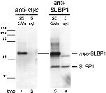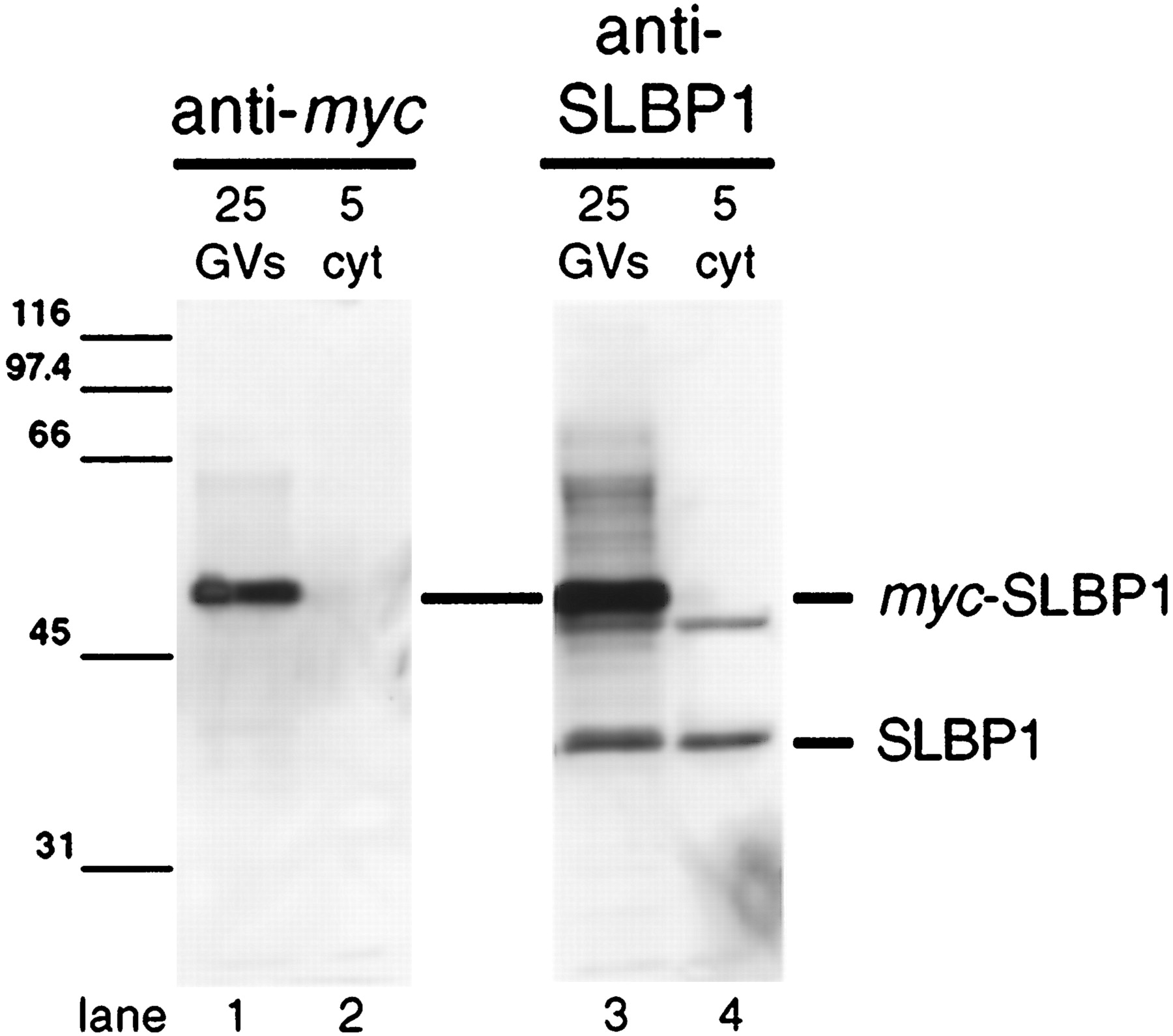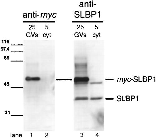 Fig. 5. Transcripts of full-length myc plus NLS–tagged SLBP1 were injected into the oocyte cytoplasm. Sixteen hours later, GVs and cytoplasms (cyt) were manually isolated, and their proteins were separated on an SDS-polyacrylamide gel. Western blots were made with mAb 9E10 against the c-myc tag (lanes 1 and 2) or with antibody X1 against SLBP1 (lanes 3 and 4). Allmyc-tagged SLBP1 is found in the nucleus and is recognized by both antibodies at a mobility corresponding to ∼50 kDa. Antibody X1 also recognizes endogenous SLBP1 in both nucleus and cytoplasm at a mobility of ∼40 kDa. It also stains a minor cross-reacting band in both nucleus and cytoplasm just below the heavy band of myc-SLBP1.