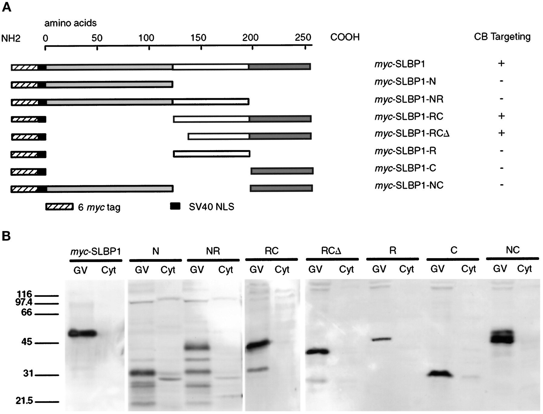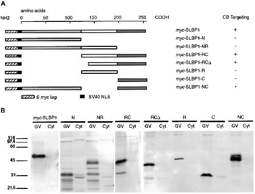 Fig. 7. (A) Full-length myc plus NLS–tagged SLBP1 and constructs were derived by deleting the amino terminus (amino acids 1–122), the RNA-binding region (amino acids 123–195), or the carboxy terminus (amino acids 196–253), either singly or in pairs. Constructmyc-SLBP1-RCΔ had a further deletion of 17 amino acids from the left end of the RNA-binding region. The table on the right shows which constructs were targeted to coiled bodies (CB). (B) In vitro transcripts were produced from clones encoding these constructs and were injected into the cytoplasm of stage V–VI oocytes. GVs and cytoplasm (Cyt) were isolated 10 h later, and expressed proteins were detected on Western blots with mAb 9E10 against the c-myc epitope. In each case a protein was detected in the GV, whereas little reactivity was seen in the cytoplasm. All constructs included an SV40 NLS to ensure import into the GV. Constructmyc-SLBP1-R has an anomalously low mobility.