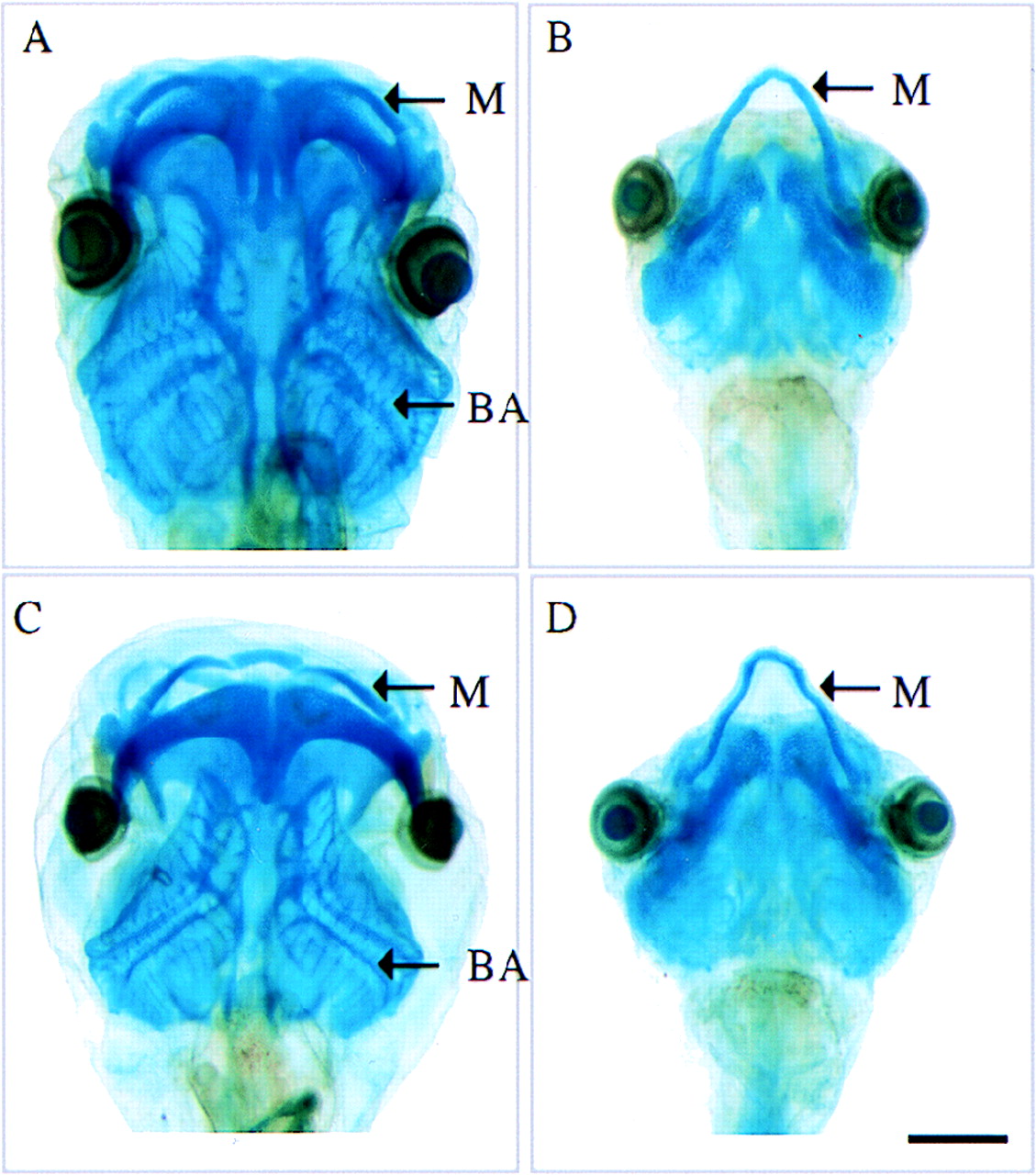 Cartilage staining of tadpoles after the T3 induction assay. (A) Normal fertilized animal. (B) Normal fertilized animal treated with T3. (C) pCS2+GFP-D3 transgenic animal treated with T3. (D) Nontransgenic sibling treated with T3. M, Meckel’s cartilage; BA, branchial arch cartilages. (Bar = 1 mm.)