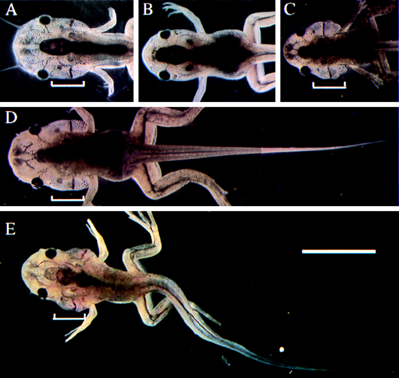Arrest of pCS2+GFP-D3 transgenic animals at stage 60–61. (A) Control animal, stage 60. (B) Control animal, stage 62. (C, D, and E) Three arrested transgenic animals showing retardation of gill and tail resorption. The brackets indicate the gills. (Bar = 1 cm.)