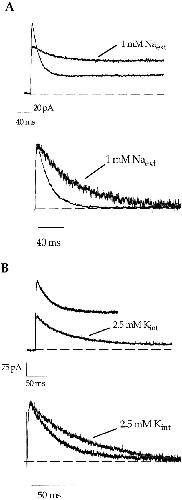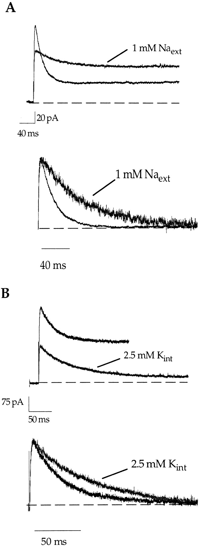 Figure 4. Both external sodium and internal potassium can slow inactivation in the A463C mutant. The control traces were elicited by a 400-ms voltage step to +100 mV in the presence of 140 mM internal sodium and external NMG+. The experiment in A was performed with an outside-out patch, while the experiment in B was with an inside-out patch. Inactivation can be slowed by 1 mM external sodium (A) and by 2.5 mM internal potassium (B). For easier comparison, the current amplitudes are scaled and the baselines subtracted in the bottom sections of both panels.