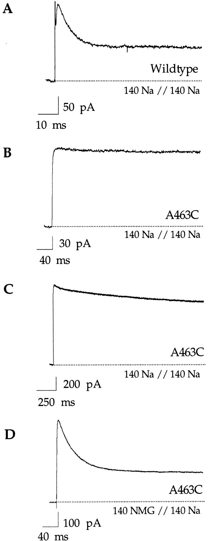 Figure 3. Properties of C-type inactivation with sodium as the conducting ion. All traces were elicited with voltage steps to +100 mV and in the presence of 140 mM internal sodium. Experiments were done in inside-out patches. (A) The wild-type Shaker channel inactivates rapidly (<20 ms) in the absence of added potassium and in the presence of symmetrical 140 mM sodium. Currents were elicited by a 100-ms voltage step. (B) In contrast, no inactivation is observed in the A463C mutant under the same ionic conditions. Currents were elicited by a 400-ms voltage step. (C) A slow decline in current is observed with longer pulses (2,000 ms). (D) In the presence of external NMG+, the A463C mutant rapidly inactivates to a steady state level. Pulse duration was 400 ms.
