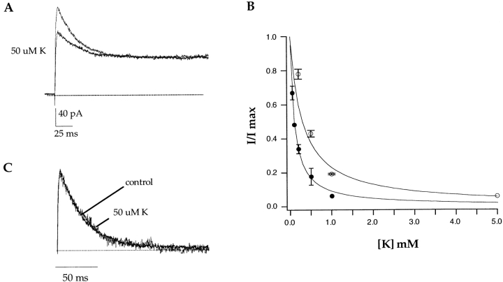 Figure 6. External potassium blocks sodium currents in A463C with a high affinity but does not slow C-type inactivation. Data shown in A were obtained from an outside-out patch in the presence of external NMG+ and internal Na+. Currents were elicited by voltage steps to +100 mV and externally applied potassium blocked the observed currents in a concentration-dependent manner (A). The data were quantified by measuring percent current remaining (I/Imax) at +100 mV versus the external potassium concentration (B, •). The error bars represent the SEM. A fit to the data with a single binding isotherm yields a Kd value of 100 μM. The empty symbols represent the identical experiment except that it was performed in the presence of symmetrical sodium. Currents were elicited by voltage steps to +100 mV or by voltage ramps from −100 to +200 mV (data not shown). The blocking data were identical regardless of the voltage protocol used and as a result it was pooled. The error bars represent the SEM. A fit to the data with a single binding isotherm yields a Kd value of 300 μM. (C) The control current and the current in the presence of 50 μM external potassium from A were scaled in amplitude and the baselines were subtracted. No change in the C-type inactivation rate is observed in the presence of 50 μM external potassium.