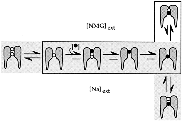 Figure 7. State diagram model of external potassium block of sodium currents in A463C. Sodium ions are represented by ○, while potassium ions are shown as •. (Outlined scheme) In the presence of external NMG+, external potassium first binds to the C-type inactivation site but proceeds to a deeper, higher affinity site in the pore. The occupancy of the deeper site by potassium does not interfere with the onset of C-type inactivation. (Shaded scheme) In the presence of external Na+, external potassium must first displace the bound sodium ion before it can proceed to the deeper site. After the higher affinity site is reached, the external (C-type) site is refilled by a sodium ion.