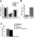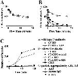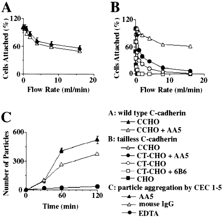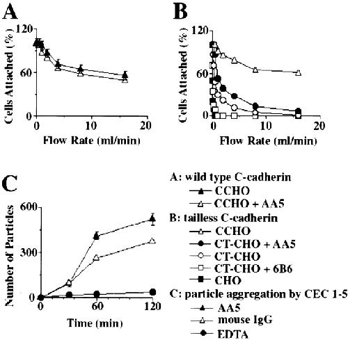 Figure 4. Analysis of mAb AA5 activity on cell lines and in vitro. (A) Effect of mAb AA5 on C-cadherinâmediated adhesion of CHO cells. C-CHO cells (expressing wild-type C-cadherin) were harvested in the presence of calcium and then allowed to attach to CEC1-5âcoated capillary tube in the presence of either mAb AA5 Fab or nonimmune mouse Fab for 30 min. Adhesive strength was measured as the resistance of cell detachment to progressively increasing flow rates. The experiment was performed in triplicate and the percentage of cells remaining ± SE was plotted as a function of flow rate. (B) Effect of mAb AA5 on the adhesive function of a cytoplasmic tail truncated C-cadherin expressed in CHO cells (CT-CHO). Adhesion of CT-CHO cells was assayed in the presence of either mAb AA5 Fab or nonimmune mouse Fab using the flow assay described in A. The effect of inhibitory mAb 6B6 is shown for comparison. The experiment was performed in triplicate and the percentage of cells remaining ± SE was plotted as a function of time. (C) Effect of mAb AA5 on the aggregation of CEC1-5âcoated FluoSpheres. Dispersed CEC1-5âcoated FluoSpheres were incubated either with mAb AA5 Fab or with nonimmune mouse IgG Fab in the presence of calcium for various time periods. As a negative control, samples were also incubated with the presence of EDTA. The number of aggregated FluoSpheres (superthreshold particles) were counted using a Coulter counter. The experiment was performed in triplicate and the number of superthreshold particles ± SE was plotted as a function of time.