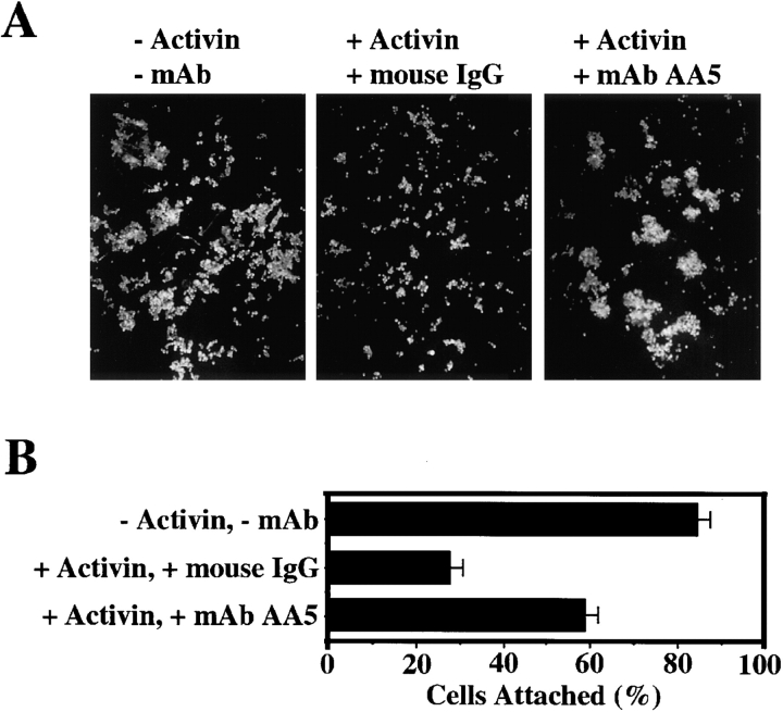 Figure 2. mAb AA5 enhances the C-cadherin–mediated adhesion of activin-induced animal cap blastomeres. (A) Blastomere aggregation assay. Dissociated blastomeres were treated with or without activin (5 ng/ml). Activin-treated blastomeres were incubated either with mAb AA5 Fab (1 μg/ml) or nonimmune mouse IgG Fab (1 μg/ml) in the presence of calcium, and then allowed to aggregate with constant shaking for 15 min. (B) Blastomere adhesion to CEC1-5. Dissociated blastomeres were treated with or without activin. Activin-treated blastomeres were incubated with either mAb AA5 Fab or nonimmune mouse IgG Fab, and then allowed to attach to spots of CEC1-5 protein coated on a tissue culture plate in the presence of calcium for 30 min. The plates were then shaken continuously for 2 min on a horizontal shaker and the numbers of blastomeres per unit area remaining attached were counted. The graph shows the results of three different experiments, each performed in duplicate.