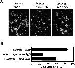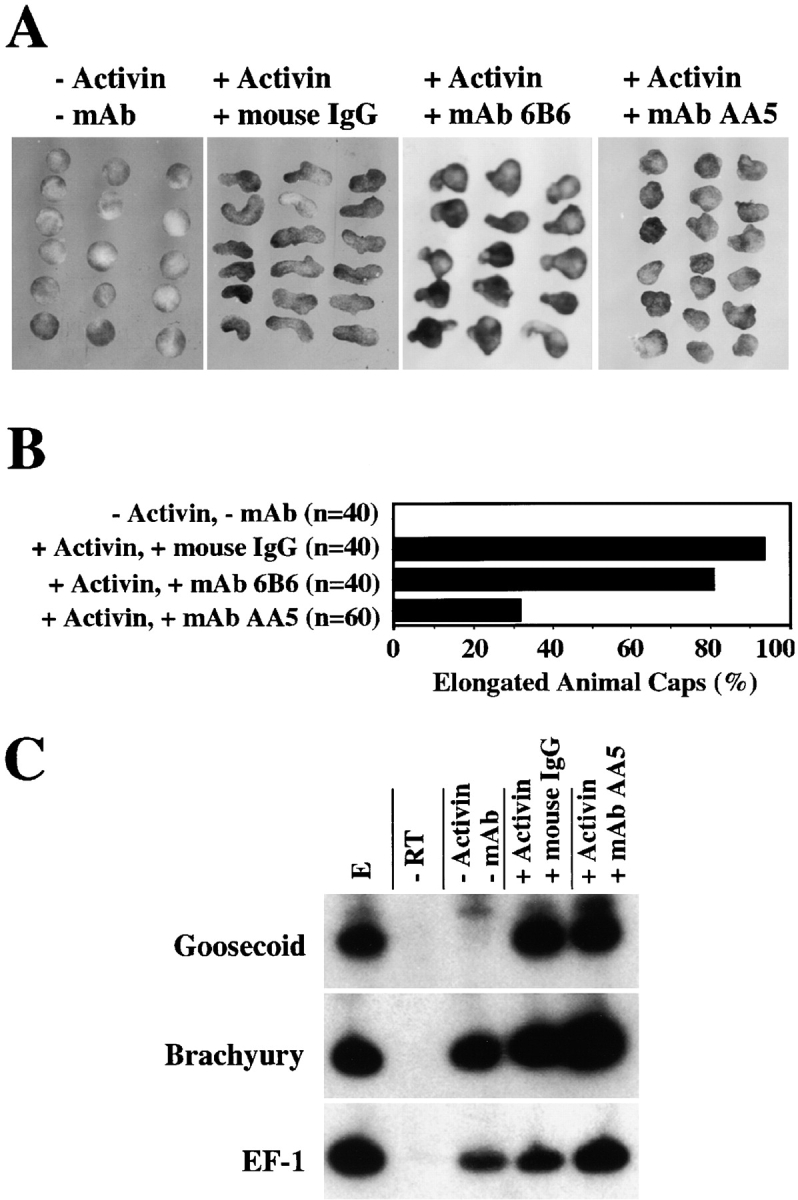 Figure 3. Inhibition of activin-induced morphogenetic movement of animal cap explants by mAb AA5. (A) Inhibition of the elongation of activin-induced animal caps by mAb AA5. Xenopus animal caps were incubated with or without activin and treated with mAb AA5 Fab (1 μg/ml), mAb 6B6 Fab (1 μg/ml), or nonimmune mouse IgG Fab (1 μg/ml). (B) Frequency of inhibition of elongation by mAb AA5. Activin-induced elongation was plotted as a percentage of the total. n = total animal caps analyzed. Any explant exhibiting a discernible protrusion was scored as elongated. (C) mAb AA5 did not inhibit the induction of expression of mesodermal gene markers in response to activin. Animal caps were incubated with or without activin and incubated either with mAb AA5 Fab (1 μg/ml) or nonimmune mouse IgG Fab (1 μg/ml) until gastrula stage 10.5. Total RNA was harvested and mRNA was analyzed by RT-PCR for the presence of the indicated transcripts. RNA from whole embryos (E) provides a positive control. The −RT lane is identical to the embryo lane, except reverse transcriptase was omitted and serves as a negative control. EF-1, ubiquitously expressed, is a loading control. Brachyury is a marker of general mesoderm. Goosecoid is a marker of dorsal mesoderm.
