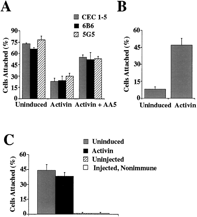 Figure 5. Activin regulation of blastomere attachment to anti– C-cadherin mAbs. (A) Attachment of uninduced, activin-induced, or activin-induced and mAb AA5-treated blastomeres to substrates coated with CEC1-5, anti–C-cadherin mAb 6B6, or anti–C-cadherin mAb 5G5. (B) Uninduced and activin-induced blastomere attachment to fibronectin. (C) Attachment of uninduced and activin-induced blastomeres expressing an IL-2β receptor–C-cadherin cytoplasmic tail fusion protein to substrates coated with anti–IL-2β receptor mAbs.