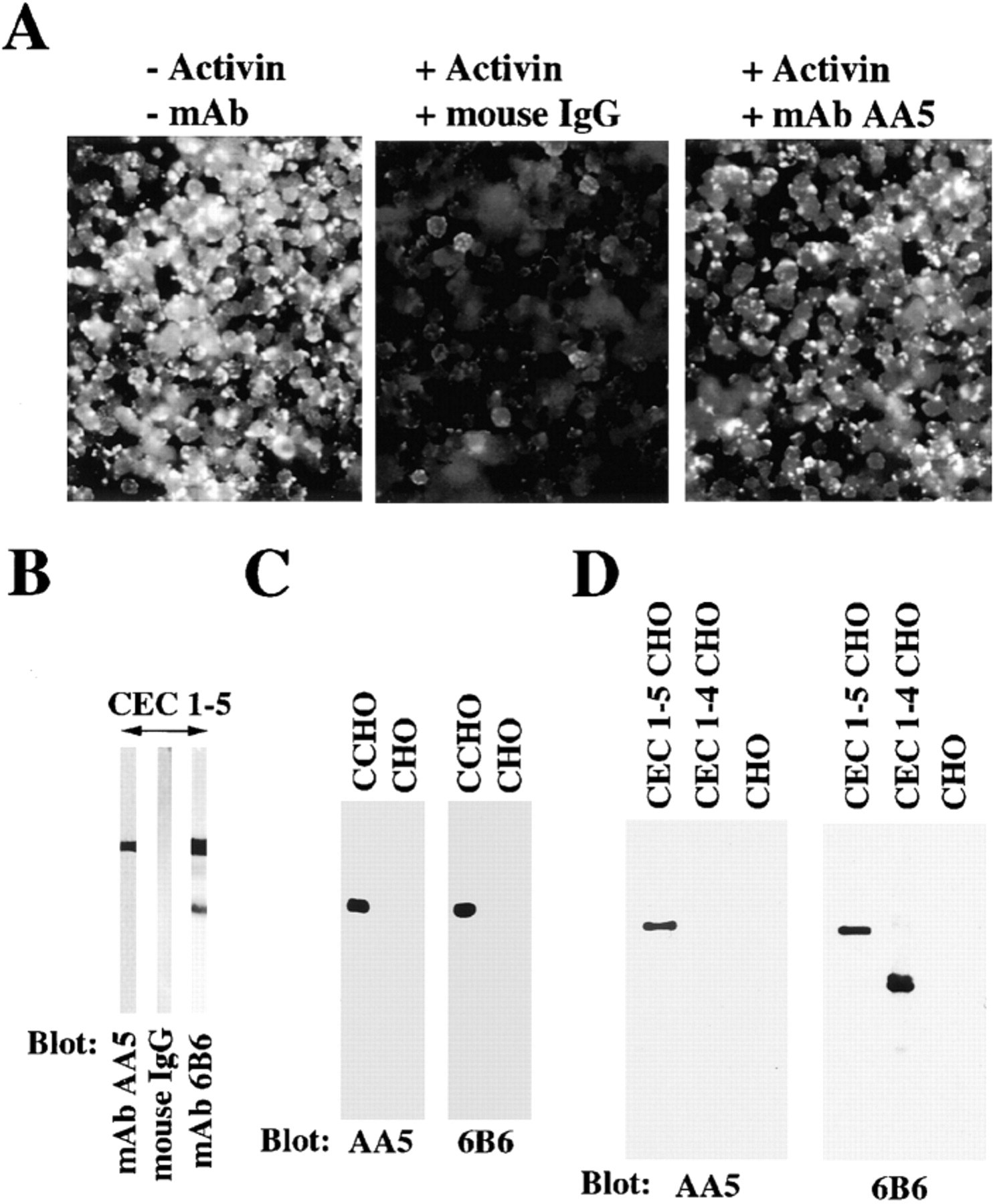Detection of anti–C-cadherin activating mAb AA5 in a functional screen. (A) mAb AA5 restores high C-cadherin–mediated adhesion to activin-treated Xenopus blastomeres. Dissociated Xenopus animal cap blastomeres were treated with or without activin (5 ng/ml). The activin-induced blastomeres were treated with either mAb AA5 hybridoma supernatant or nonimmune mouse IgG. Blastomere samples were then incubated with CEC1-5–coated FluoSpheres in the presence of calcium for 60 min. (B, C, and D) Western blot analysis demonstrating mAb AA5 binds to domain 5 of C-cadherin. CEC1-5 protein (B), CEC1-5 expressing CHO cell extracts (C), and CEC1-4 expressing CHO cells extracts (D) were probed with anti–C-cadherin 6B6 mAb, AA5 mAb, or nonimmune mouse IgG.