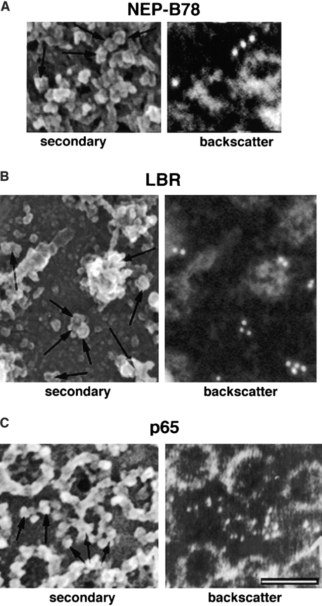 Figure 2. Immunogold electron microscopy reveals the distribution of NEP-B78, LBRx, and p65 between the inner and outer nuclear envelope. Germinal vesicles (GVs) were isolated manually from stage VI oocytes and spread on silicon chips. Using this approach, areas of inner and outer nuclear membrane are both revealed and can be readily distinguished by reference to nuclear pore morphology (Goldberg and Allen, 1992). Spread GVs were labeled with mAb 3E9 (A), rabbit anti-LBR (B), or mAb CEL5C (C) followed by 10-nm gold-conjugated secondary antibodies. Using this approach the distribution of gold labeled antibodies can be detected either in backscatter (revealing white spots corresponding to the position of 10-nm gold; right-hand panels in AâC) or using the secondary electron detector (revealing antibody gold particles of â¼20-nm diam, arrows in left-hand panels in AâC). Bars, 200 nm. |