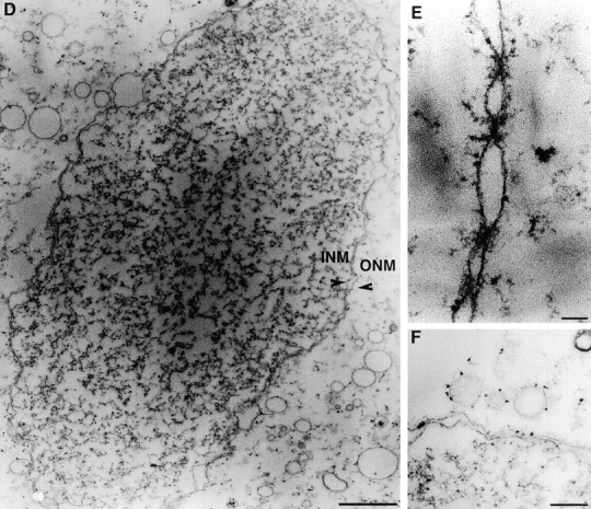 Figure 6. Electron microscope analysis of vesicle binding and fusion. MP2 was incubated with sperm chromatin and cytosol alone (A–C) or with sperm chromatin, cytosol, and MP1 (D–E) as described in Materials and Methods. Incubations for the samples displayed were for 2 h at room temperature after which time the extracts were fixed and sectioned for TEM. A–C show MP2 vesicles bound to the surface of partially decondensed sperm chromatin. White arrows show details of membrane morphology at sites of interaction with chromatin (B). Black arrows show typical membrane morphology at sites adjacent to other vesicles (C). D–F show nuclear envelope structures typically observed in fully reconstituted extracts. Double unit membranes formed a continuous boundary around decondensed chromatin (D) and contained structures resembling nuclear pores (E) and were studded with ribosome-like particles (F, arrowheads). INM, inner nuclear membrane; ONM, outer nuclear membrane. Bars: (A and D) 1 μm; (B and E) 100 nm; (C and F) 200 nm. |