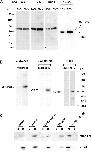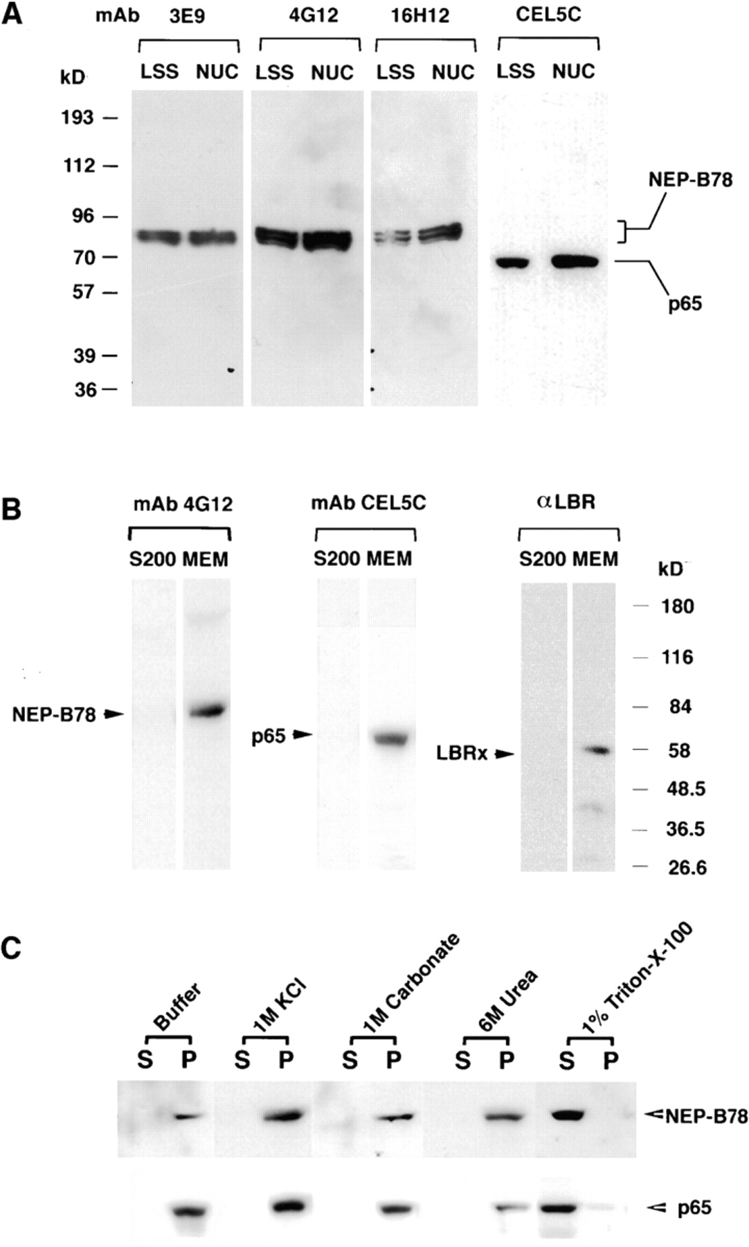 Figure 1 Immunoblotting analysis of NEP-B78, p65, and LBRx. (A) Egg extracts (LSS) or isolated sperm pronuclei (NUC) were resolved by 8% SDS-PAGE, transferred to nitrocellulose and blotted with one of mAbs 3E9, 4G12, 16H12 or CEL5C. 3E9, 4G12 and 16H12 all detected a protein migrating with a Mr of 78 kD (termed NEP-B78) in each fraction. CEL5C detected a single band migrating at 65 kD (termed p65) in each fraction. The positions of prestained molecular mass markers are shown at the left-hand side of the panel. (B) Xenopus LSS was fractionated by centrifugation at 200,000 g for 4 h to yield membrane-free supernatant (S200) and a nuclear membrane precursor fraction (MEM) that is sufficient for complete NE assembly (Smythe and Newport, 1991). Equivalent volumes of each fraction were resolved by SDS-PAGE and subjected to immunoblotting with the indicated antibodies for NEP-B78, p65, or LBRx. (C) Oocyte germinal vesicles were manually dissected from stage six oocytes and incubated with egg lysis buffer (Buffer), 1 M KCl, 1 M Na2CO3 (1 M carbonate), 6 M Urea or 1% Triton X-100 (all in egg lysis buffer). Soluble proteins (S) were separated from insoluble proteins (P) by centrifugation, resolved on 8% SDS-PAGE and blotted with either 4G12 or CEL5C. Only Triton X-100 was capable of solubilizing NEP-B78 and p65. |