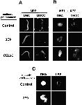 Figure 10. Effect of NEP-B78 and p65 mAbs on vesicle recruitment and nuclear assembly. Aliquots of MP2 membranes were incubated with either anti-cytokeratin 18 mAb (CK-18) as control or anti-NEP-B78 mAB 3E9 or the anti-p65 mAb CEL5C and reisolated as described in Materials and Methods. (A) Vesicle recruitment assays were performed using demembranated sperm chromatin and cytosol supplemented with indicated antibody- treated MP2 alone. (B and C) NE assembly assays were performed using sperm chromatin, cytosol plus MP1 and indicated antibody-treated MP2. In A and B, DNA was stained with Hoechst 33258 (left-hand panels) and membranes are stained with DHCC (right-hand panels). In (C) MP2 previously treated with control CK-18 mAb or 3E9 was incubated with cytosol, MP1 and sperm chromatin, fixed for immunofluorescence and probed for the presence of LBRx using an FITC-labeled secondary antibody. Left-hand panels show DNA stained with DAPI with corresponding fluorescein-labeled images to the right. |