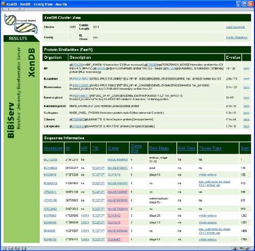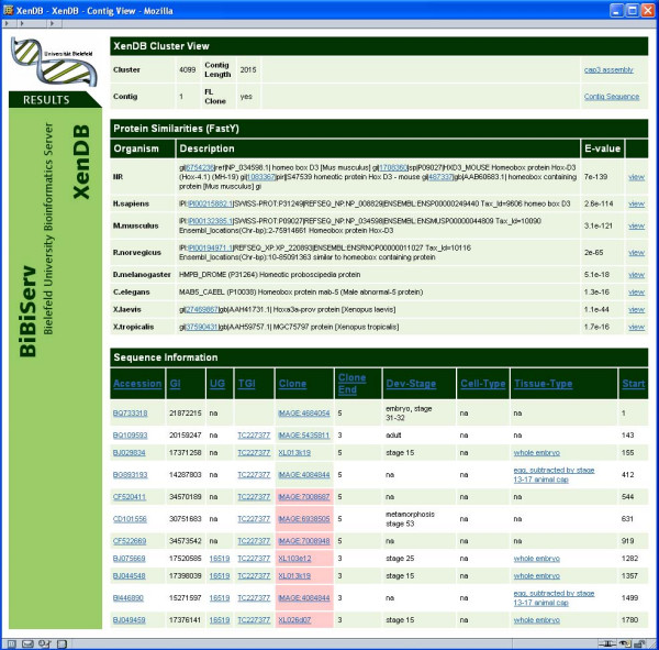 Figure 5. Cluster view of the XenDB Web interface. Best FASTY hits to NR protein database, five model organisms and Xenopus proteins are shown on top. Gene Ontologies (GO) are based on best human and mouse IPI hits, functional categories on hits to COG and KOG databases. Below, additional information for each EST in the cluster is shown, such as accession, UniGene and TGI id, clone, cell and tissue type. Clones predicted not to be full length are colored red. Links to CAP3 assembly and TC sequence are provided.