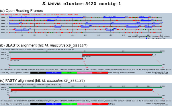 Figure 2. Comparison of a BLASTX alignment with corresponding full length FASTY alignment, as generated by the Genlight system. Blue boxes in (a) indicate open reading frames, green boxes start and red boxes stop codons, respectively. The assembled TC sequence has a frameshift at position 1150 from frame 1 to 3, generating two distinct HSPs in the BLASTX alignment (b). FASTY clearly corrects this frameshift and generates a full length alignment (c).