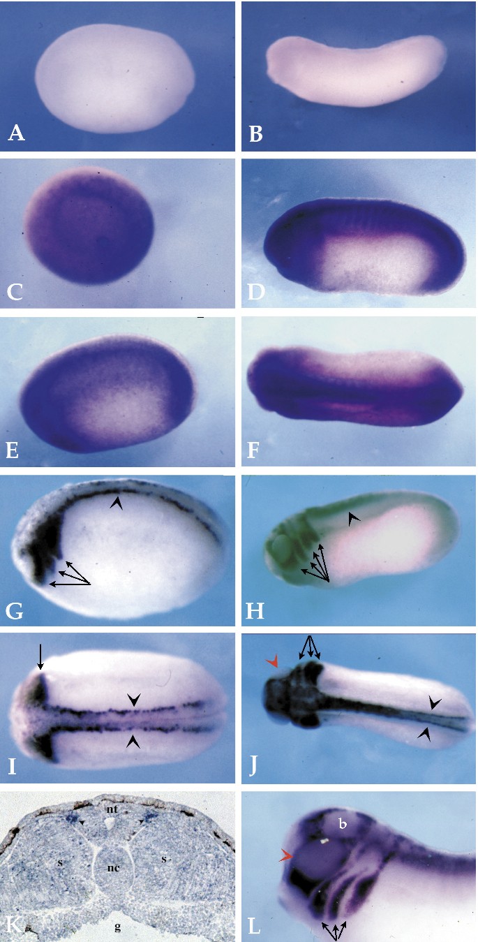 FIG. 3. Whole mount in situ mRNA hybridization of embryos at different developmental stages with xmdc9 and xmdc11a cRNA, and hybridization of a tailbud stage embryo section with xmdc11a cRNA. Albino X. laevis embryos at various developmental stages were hybridized with an xmdc9 sense probe (A, B), an xmdc9 antisense probe (C), or an xmdc11a antisense probe (G). All embryos are oriented with their anterior toward the left of the figure. A shows a lateral view of a late neurulaembryo (stage 20), and B shows a tailbudembryo (stage 30). Both embryos were hybridized with the sense xmdc9 control probe. C shows that xmdc9 expression can be detected in the entire gastrula stage embryo. In a neurulaembryo (E, stage 20) xmdc9 mRNA is present along the entire anteroposterior axis with a more pronounced staining on the dorsal side. At stage 25 (D), an essentially similar localization is observed in the head, the dorsal trunk structures and the tail bud. In addition, a more pronounced staining of the somites is visible. In a dorsal view of a tailbudembryo (F, stage 25), expression of xmdc9 appears strongest in dorsal structures. G and I show a lateral and dorsal view, respectively, of a late neurulaembryo (stage 20) hybridized with an xmdc11a antisense probe. The most anterior signal is divided into three populations of cells (arrows) extending from the neural tube. In the trunk, a thin line of cells on either side of the neural tube express xmdc11a (black arrowheads). K shows a transverse section through the trunk of a tailbudembryo (stage 22). Two rows of xmdc11a-expressing cells (small black arrowhead) extend along the sides of the neural tube (nt). The somites (s), gut (g), and notochord structures (nc) are also indicated. In a lateral view of a tailbud stage embryo (H, stage 25), xmdc11a staining is present in four groups of cells (arrows) within the head and branchial arches. J demonstrates that expression in the same anterior structures as in H can be seen in a dorsal view of a tailbudembryo. No xmdc11a expression is detected in the optic vesicle (J, red arrowhead). In the trunk, the staining clearly appears along two stripes on either side of the midline. L depicts a magnification of the anterior region of a tailbud stage embryo. xmdc11a mRNA is localized to the four segments derived from the cranial neural crest. From posterior to anterior, these structures correspond to the posterior branchial crest, the anterior branchial crest, the hyoid crest, and the mandibular crest. The optic vesicle is marked by a red arrowhead, and the brain is indicated (b).