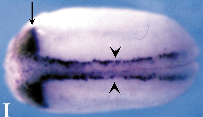 adam11( ADAM metallopeptidase domain 11 ) gene expression in Xenopus laevis embryo, NF stage 22, as assayed by in situ hybridization, dorsal view, anteriorleft.