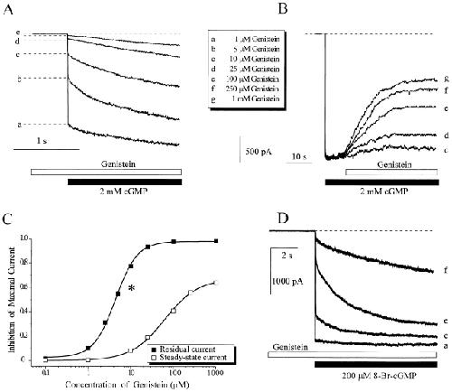 Figure 3. Closed channels are more sensitive to genistein inhibition than are activated channels. (A) Inhibition of closed channels by preexposure to various concentrations of genistein for 1 min. Closed channels were activated by application of 2 mM cGMP. Residual currents at five different genistein concentrations are indicated by dotted lines, and the genistein concentrations are indicated by letter to the right of each trace. In A, B, and D, the letter refers to the genistein concentration key. Note that the amplitude of the residual current is inversely proportional to the genistein concentration. (B) Inhibition of steady state CNG current, maximally activated by saturating cGMP (2 mM). The effects of five different genistein concentrations are indicated by letter to the right of each trace. (C) Dose–inhibition curves of the effect of genistein on closed (residual current as in A) and maximally activated channels (steady state current, as in B). Continuous curves show fits of the data to the Hill equation (see materials and methods). The asterisk depicts inhibition of current activated by saturating cGMP, after preexposure to genistein (10 μm) in conjunction with a saturating concentration of cAMP (20 mM). Note that preexposure to cAMP has only a minor effect on genistein inhibition (n = 6 experiments). (D) Inhibition of native CNG channels from salamander rod outer segments after preexposure to various concentrations of genistein for 1 min. The effects of four different genistein concentrations are indicated by letter to the right of each trace.