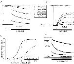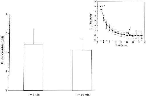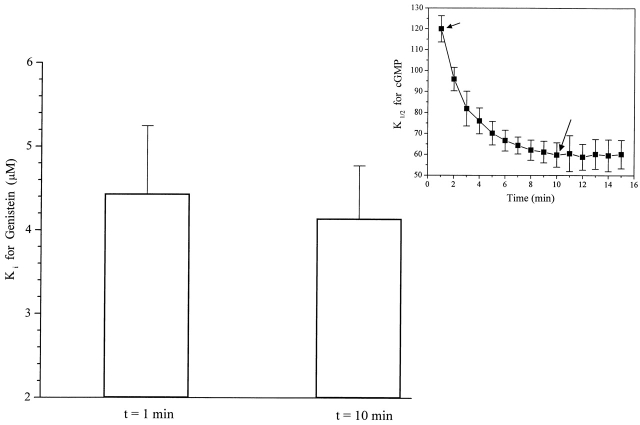 Figure 6. Effect of genistein on the rod CNG channels at different times after patch excision. Genistein was applied on closed rod CNG channels at different times after excision from the oocyte, and residual current was measured after application of cGMP. Bar graph represents mean ± SEM for five patches at 1 and 10 min after excision. During the first 10 min after excision, the K1/2 for cGMP activation gradually declines (see inset), resulting from tyrosine dephosphorylation (Molokanova et al., 1997). The bar graph shows that channels are equally sensitive to genistein, independent of phosphorylation state.
