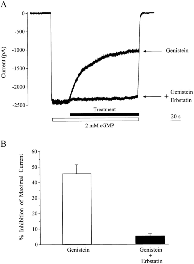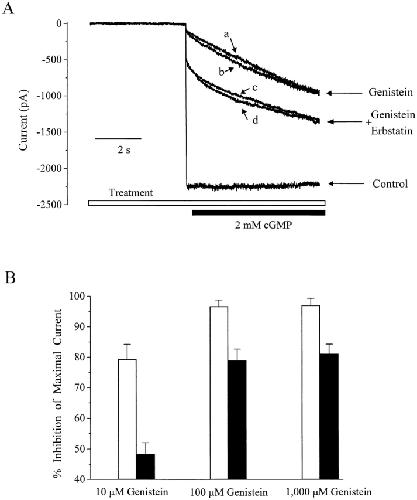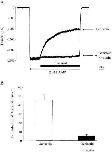Figure 8. Effect of erbstatin on genistein inhibition of maximally activated channels. (A) Genistein (100 μM) inhibition of CNG current activated by 2 mM cGMP in the absence and presence of 100 μM erbstatin. (B) Summary data for genistein inhibition alone (open bars) and with erbstatin (closed bars). n = 5–8 for each condition.
