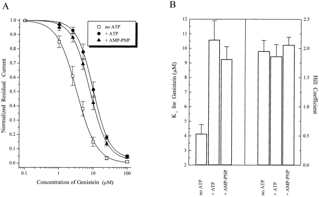 Figure 5. Competitive effects of ATP and AMP-PNP on genistein inhibition. (A) Dose– inhibition curves for genistein alone (n = 13), genistein plus 200 μM ATP (n = 7), and genistein plus 200 μM AMP-PNP. Continuous curves show fits to the Hill equation. (B) Histogram showing Ki and Hill coefficient values for genistein inhibition curves. Data represents mean ± SEM for all individual experiments included in A. Note that ATP and AMP-PNP increase the Ki for genistein without affecting the Hill coefficient.