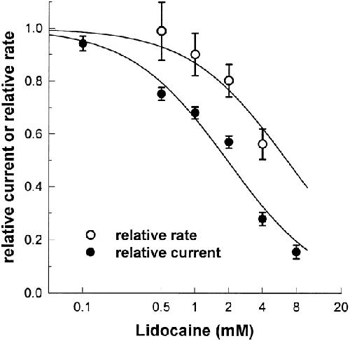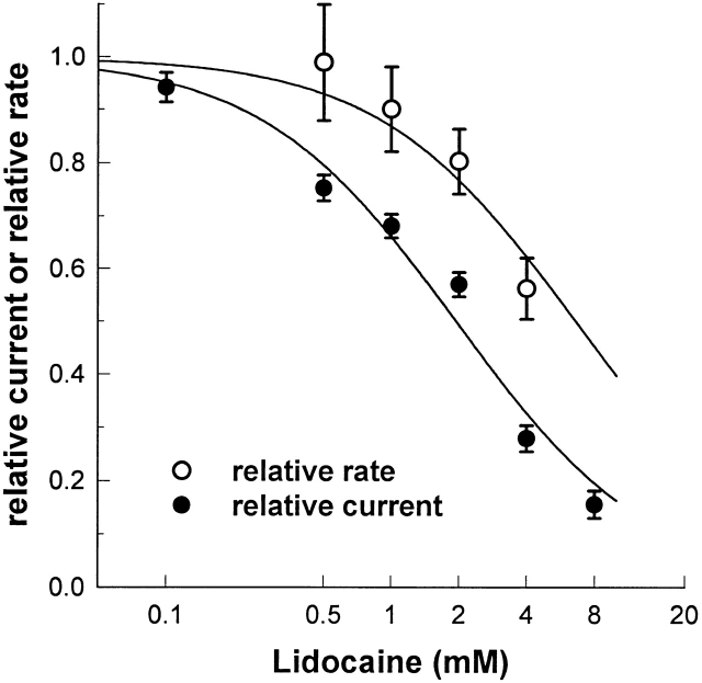 Figure 3. Effect of tonic block on accessibility of site 1304. Tonic block of F1304C (•) was evaluated by dividing the peak current obtained from infrequent depolarizations to −20 from −120 mV in the presence of 0.1, 0.5, 1.0, 2.0, 4.0, or 8.0 mM lidocaine by the peak current in the absence of drug (n = 4 for each point). These data were fit to a binding curve with a hill coefficient of 1.0, giving a Kd of 1.9 mM. Also shown in the graph is the modification rate of F1304C with 8 μM MTS-ET at −120 mV in the presence of 0.5 (n = 4), 1.0 (n = 10), 2.0 (n = 8), or 4.0 (n = 10) mM lidocaine divided by the rate measured without lidocaine present (n = 4) (○). The rates were measured using the protocol shown in Fig. 2 A. A fit to the modification rate data gives a Ka of 6.6 mM. |