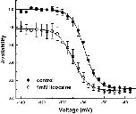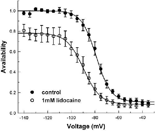 Figure 4. Effect of lidocaine on the steady state availability curve of F1304C. h∞ curves were recorded with 200-ms prepulses, followed by a test pulse to −20 mV. For each patch, the h∞ curve was measured in the absence and presence of 1.0 mM lidocaine (n = 5) in rapid succession. In other experiments without lidocaine, we did not observe significant left shifts in gating after patch excision on the time scale of these experiments. Data from each curve was fit with a Boltzmann with maximal value (Imax), half-maximal voltage (V1/2), slope (k), and nonzero plateau (c) as free parameters. The graph shows data normalized to the maximum value for curves measured in the absence of lidocaine, and then averaged across trials. Without lidocaine, V1/2 = −78.9 ± 1.9 mV, k = 6.2 ± 0.7 mV, and c = 0.11 ± 0.02. In 1.0 mM lidocaine, V1/2 = −89.7 ± 1.8 mV, k = 7.1 ± 0.4 mV, c = 0.08 ± 0.02, and Imax in 1.0 mM lidocaine was 78 ± 6% of Imax in the absence of lidocaine. This represents a hyperpolarizing shift in the apparent h∞ curve by 10.8 ± 2.6 mV. |