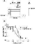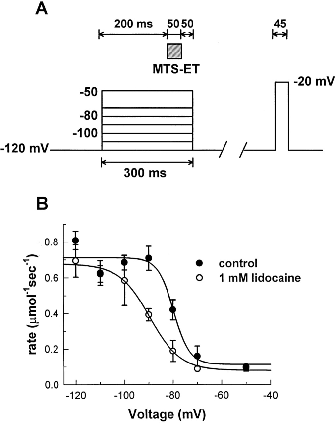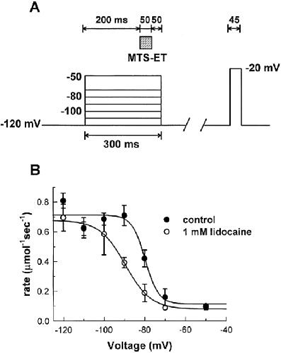 Figure 5. Effect of lidocaine on the voltage dependence of site 1304 accessibility. The rate of MTS-ET modification of F1304C was measured at a variety of voltages, as shown in A. Excised, inside-out patches underwent a series of 300-ms depolarizations: 200 ms to achieve steady state fast inactivation, followed by 50 ms for exposure to 8.0 μM MTS-ET, and a final 50-ms period after exposure to insure complete washout of MTS-ET before repolarization. After each 300-ms depolarization, the patch was maintained at −120 mV for enough time to insure complete recovery (2–8 s, depending on the conditioning voltage) before assaying macroscopic current with a test pulse to −20 mV. Modification rates are shown in B when the experiments were conducted in the absence (•) and presence (○) of 1.0 mM lidocaine. (On average, n = 6, n = at least 3 for each point.) |
