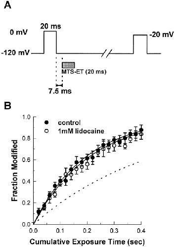 Figure 7. Lidocaine does not slow the return of site 1304 accessibility after brief depolarizations. In the protocol diagrammed in A, 20-ms exposures to 8 μM MTS-ET were timed to occur 7.5 ms after 20-ms depolarizations to 0 mV. The macroscopic current was assayed between each exposure, and modification rates were measured as shown in Fig. 2. The 7.5 ms reflects the experimentally measured delay between the voltage command to the piezoelectric stack (which occurred exactly at the end of the conditioning pulse) and the commencement of solution exchange (for details, see Vedantham and Cannon, 1998). B shows the average of several modification experiments conducted with or without 1.0 mM lidocaine. The solid lines are exponentials whose time constants are the mean values of the time constants obtained from fits to data from individual experiments. The dashed line reflects the curve that would be expected if the accessibility of site 1304 paralleled the degree of Na+ channel availability in 1.0 mM lidocaine during the exposure. The fraction of current recovered in the presence of 1.0 mM lidocaine after 8-, 10-, and 20-ms recovery times was averaged (corresponding to the shaded area in Fig. 6), giving 0.2962. An accessibility of 0.30 predicts a rate of 2.1 s−1 at 8 μM MTS-ET (predicted rate = 0.30 × (Rmax − Rmin) + Rmin), or 0.26 μmol−1 s−1. |