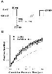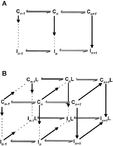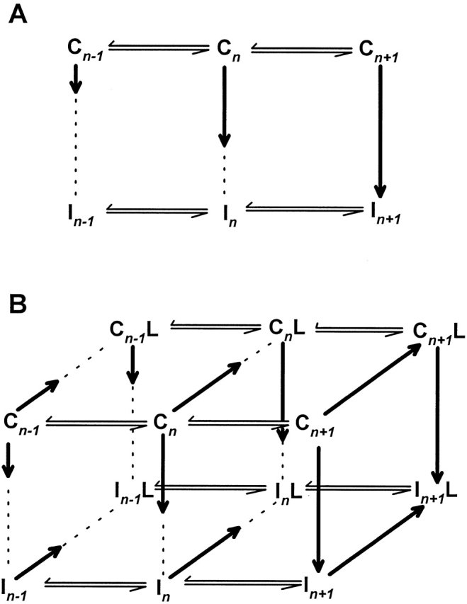 Figure 8. A model for lidocaine action. In A, a section of the activation pathway for sodium channels is shown, in which each noninactivated state (Cn) is connected to an inactivated state (In). The length of the vertical arrows between inactivated and noninactivated states indicate the degree to which the equilibrium favors inactivated channels: the longer the arrow, the greater the fraction of inactivated channels. Thus, depolarization causes rightward movement and increases the fraction of inactivated channels. In B, a set of states is added to the model that incorporate lidocaine binding. The arrows that move between unbound (Cn or In) and lidocaine-bound states (CnL or InL) indicate the degree to which the equilibrium favors lidocaine binding: the longer the arrow, the greater the fraction of lidocaine-bound channels. Thus, as for the case of inactivation, depolarization favors lidocaine block as well as inactivation. The model implies that addition of lidocaine causes a rightward shift in the distribution of channels owing to coupling between activation and lidocaine binding, while the vertical equilibria experience no such coupling (explaining why recovery from fast inactivation is not altered in lidocaine-bound channels). The rightward movement of the distribution will tend to increase the fraction of channels that are inactivated, thereby causing a shift in the h∞ curve. The slowing of repriming is a result of the slow dissociation of lidocaine from the CnL states. |