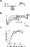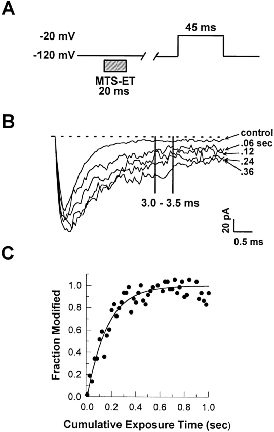 Figure 2. Measurement of the rate of MTS-ET modification of F1304C in the presence of lidocaine. The experimental protocol shown in A consists of a series of 20-ms exposures of excised inside-out patches to 8 μM MTS-ET with test pulses between each exposure. 1.0 mM lidocaine was present at all times. In B, selected traces from the modification experiment described in A are superimposed. To determine the degree of modification after each trace, the value of the macroscopic current between 3 and 3.5 ms after depolarization was averaged. Rates were determined by fitting the degree of modification of each trace as a function of cumulative exposure time with a monoexponential containing a maximum value after complete modification, a nonzero initial value before modification, and a time constant as free parameters. C shows these averages, normalized to the difference between the maximum value and the initial value, plotted against cumulative exposure time, with the normalized curve fit superimposed. |