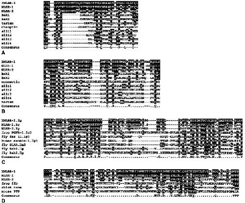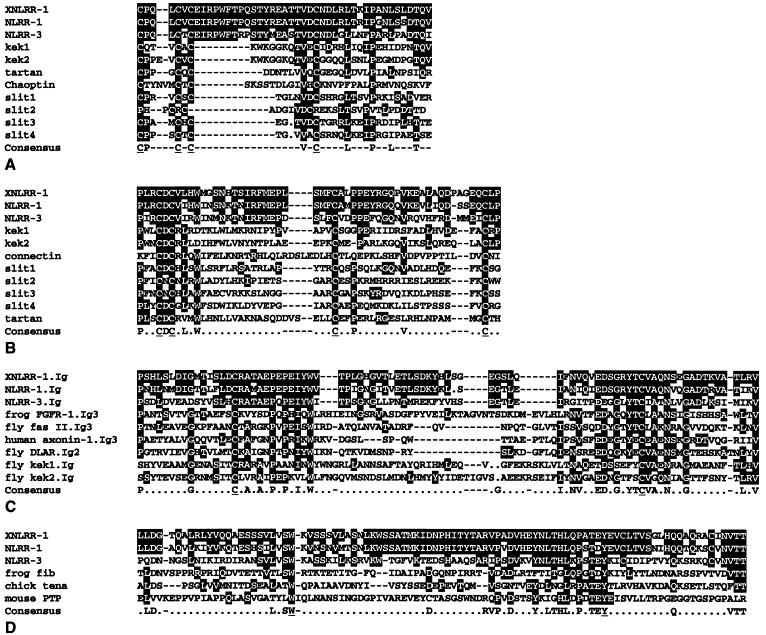 Comparative analysis of AFRs, CFRs, Ig domains and FN III repeats of XNLRR-1 with other related proteins. Databases were searched with individual domains. Conserved cystein residues are underlined. Consensus sequences are shown below. (A) Alignment of AFRs. (B) Alignment of CFRs. (C) Alignment of C2-type Ig-like domains. DLAR, Drosophila receptor tyrosine kinase. (D) Alignment of FN III repeats. Conserved tryptophan and tyrosine residues are underlined. fib, fibronectin; PTP, receptor-like protein tyrosine phosphatase; tena, Tenascin.