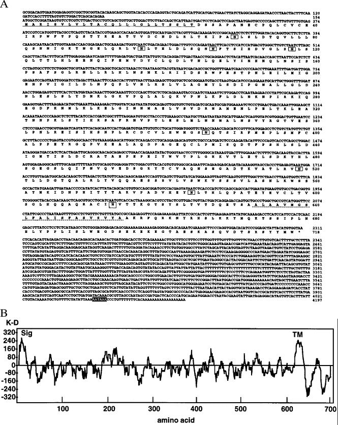 The XNLRR-1 cDNA sequence predicts a glycosylated transmembrane protein. (A) cDNA sequence and deduced amino acid sequence of XNLRR-1. Poly(A) adenylation signal sequence (AATAAA) is highlighted. The putative hydrophobic signal sequence and transmembrane region are marked by underlines and dotted underlines, respectively. Potential N-linked glycosylation sites are highlighted in the square box. (B) Hydrophobicity analysis (Kyte and Doolittle, 1982) of the predicted amino acid sequence of XNLRR-1 with a window of five residues indicating the N-terminal and C-terminal hydrophobic stretches, characteristic of signal sequence and transmembrane region, respectively. The hydrophobic stretches appear as positive values. Both regions are indicated. Sig, signal sequence; TM, transmembrane.