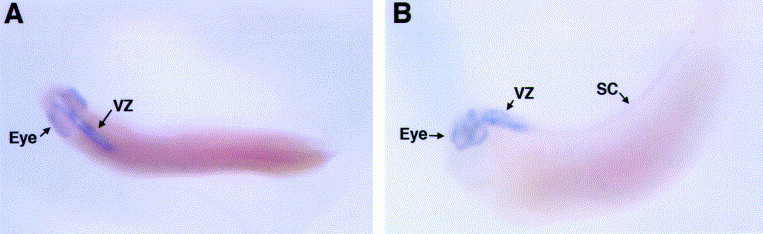 Spatial expression pattern of XNLRR-1 by whole-mount in-situ hybridization. (A) Dorsal view of a stage 33 embryo showing staining of the ventricular zone from the diencephalon to the hindbrain. (B) Lateral view of the embryo pictured in (A), showing staining of the developing eye area and the brain. A weak signal is also detected in the spinal cord. SC, spinal cord; VZ, ventricular zone.