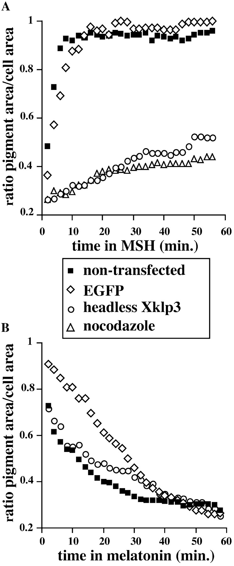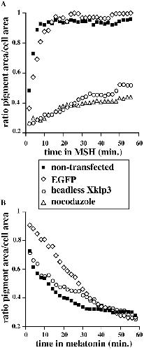 Figure 5. Headless Xklp3 affects the kinetics of pigment dispersion but not aggregation. Video-microscopic analysis of pigment movement was conducted on nontransfected melanophores, on melanophores 72 h after transfection, or immediately after treatment with nocodazole (see detailed description in Materials and Methods). Representative plots of changes in pigment distribution, determined by the ratio of pigment area to total cell area over time: (A) dispersion; (B) aggregation.