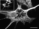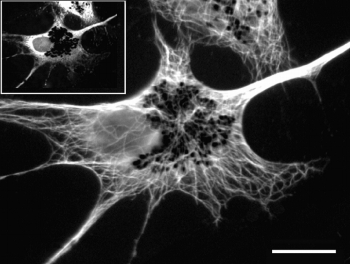 Figure 4. Distribution of microtubules is not affected by expression of headless Xklp3. Immunofluorescence staining with an antitubulin primary antibody followed by a Texas red secondary in a melanophore overexpressing the headless Xklp3. Microtubules radiate from the cell center, forming a highly organized polar array. The inset is a fluorescence image taken at the green channel, showing that the cell in the large picture expresses the EGFP-headless Xklp3 fusion protein. Bar, 20 μm.