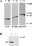 Figure 1. (A) All subunits of the heterotrimeric motor protein, kinesin II, are present on melanosomes. Western blots of cell extracts and purified melanosomes probed with antibodies against the motor subunits of kinesin II. Lanes C are cell extracts, and lanes M are purified melanosomes. The first two lanes were probed with K2.4 to detect the 85-kD motor subunit, the following two lanes were probed with a polyclonal anti-Xklp3 to detect the 95-kD motor subunit, and the last two lanes were probed with a polyclonal anti–sea urchin KAP 115 to detect the 115-kD accessory subunit. Notice that all the subunits are enriched in the melanosome fraction. (B) The overexpressed EGFP-headless Xklp3 protein forms a complex with the endogenous 85-kD motor subunit. Melanophore extracts were prepared from cells transfected with pEGFP-C1 or pEGFP-headless Xklp3, immunoprecipitated with an anti-GFP antibody, and probed with K2.4 to detect the 85-kD motor subunit. Shown are Western blots from both immunoprecipitates. The 85-kD subunit coimmunoprecipitates with EGFP-headless Xklp3 (lane 1), but not with EGFP alone (lane 2).