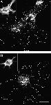 Figure 6. Distribution of lysosomes is not affected in melanophores overexpressing headless Xklp3. Cells exhibit normal lysosomal movement in response to changes in pH (dispersed in acidic conditions, clustered in alkaline conditions). Upon treatment with low pH, lysosomes redistribute through the entire cytoplasm (A). Normal perinuclear distribution is reestablished upon treatment with high pH (B). Transfected cells expressing the EGFP-headless Xklp3 fusion protein are shown in the insets, while in the large pictures the cell outlines are traced, and lysosomes stained with Texas red dextran are shown. Bar, 20 μm.