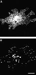 Figure 7. SUK4 inhibits dispersion of lysosomes but does not affect melanosomes. Melanophores with labeled lysosomes were injected with SUK4 and then exposed to acidic conditions in presence of MSH. Injected cells were identified by staining with a rhodamine anti–mouse antibody. (A) Overlay of bright field and fluorescence images, showing that melanosomes are normally dispersed in an injected cell. (B) Clustered distribution of lysosomes, labeled with FITC-dextran, in acidic conditions. Instead of normally dispersed through the cytoplasm, they remain clustered in the cell center. Bar, 20 μm.