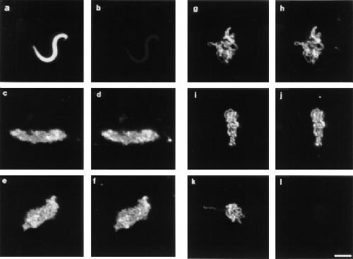 Figure 4. Immunolocalization of pEg7 on mitotic chromosomes assembled in vitro. Chromosomes were assembled under standard conditions (see Materials and Methods) and aliquots were taken to analyze DNA at different time points. Samples were fixed and DNA was stained with ethidium bromide (a, c, e, g, i, and k) and pEg7 was detected by indirect immunofluorescence using anti–pEg7 G immune serum (b, d, f, h, and j) or preimmune serum as a control (l). (a and b) 0 min, (c and d) 15 min, (e and f) 30 min, (g and h) 60 min, (i–l) 120 min. Bar, 5 μm.
