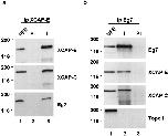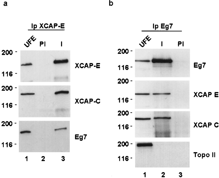 Figure 6. pEg7 is a component of the 13S condensin complex. (a) Immunoprecipitation of XCAP-E was performed using preimmune serum (lane 2) or immune serum (lane 3). Immunoprecipitates were analyzed on SDS-PAGE, transferred to a nitrocellulose filter, and probed with anti–XCAP-E (top), anti–XCAP-C (middle), or anti–pEg7 P1 (bottom). An unfertilized egg was used as an internal standard (lane 1). (b) Immunoprecipitation of pEg7 was performed using anti–pEg7 P1 immune serum (lane 2) or preimmune serum (lane 3). Immunoprecipitates were analyzed on SDS-PAGE, transferred to a nitrocellulose filter, and probed with anti–pEg7 P1, anti–XCAP-E, anti–XCAP-C, and anti–topoisomerase IIα (top to bottom).