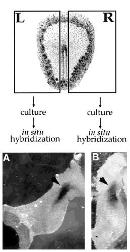Fig. 4. Chick explants regenerate node without correct LR asymmetry. A. Left and right explants, when cultured for 10–20 hours, exhibit Shh