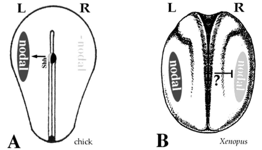 Recent experiments have suggested a pathway of genes that regulate left-right asymmetry in vertebrate embryogenesis. The most downstream member of this cascade is nodal (XNR-1 in frogs), which is expressed in the left-side lateralmesoderm. Previous work in the chick [Levin, 1998] suggests that an inductive interaction by Shh (Sonic hedgehog) present at the midline was needed for the left-sided expression of nodal, which by default would not be expressed. Interestingly, it has been reported [Lohr et al., 1997] that in Xenopus, right-side mesoderm that is explanted at st. 15 and allowed to develop in culture, goes on to express nodal, suggesting that lateralmesoderm expresses this gene by default and that a repression of nodal by the midline is needed to achieve asymmetry. Such a contradiction raises interesting questions about the degree of conservation of the mechanisms upstream of nodal asymmetry and, in general, about the differences in the LR pathway among species. Thus we examined this issue directly. We show that in the chick, as in the frog, explanted mesoderm from both sides does, indeed, go on to express nodal, including both the medial and lateral expression domains. Ectopic nodal expression in the medial domain on the right side is not sufficient to induce an ectopic lateral domain. We also show that explanted lateraltissue regenerates node/notochord structures exhibiting Shh expression. Furthermore, we show that Xenopus explants done at st. 15 also regenerate notochord by the stage at which XNR-1 would be expressed. Thus explants are not isolated from the influence of the midline. In contrast to the midline repressor model previously suggested [Lohr et al., 1997] to explain the presence of nodal expression in explants, we propose that the expression is due to induction by signals secreted by regenerating node and notochordtissue (Shh in the chick). Thus our results are consistent with Shh being necessary for nodal induction in both species, and we provide an explanation for both sets of data in terms of a single conserved mechanism upstream of nodal expression.