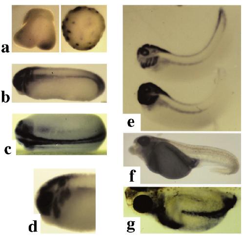 Fig. 5. Localized expression of Xenopus p300/CBP mRNA analyzed by in situ hybridization during early embryogenesis. In situ hybridization
