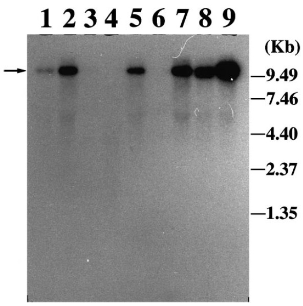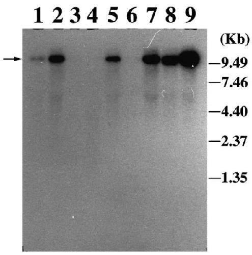 5: kidney; lane 6, muscle; lane 7, spleen; lane 8, testis; lane 9,