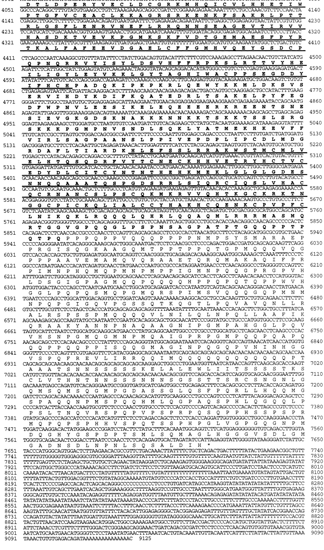 Fig. 2. Nucleotide sequence and deduced amino acid sequence of the cDNA encoding Xenopus p300/CBP. Numbers on the right and