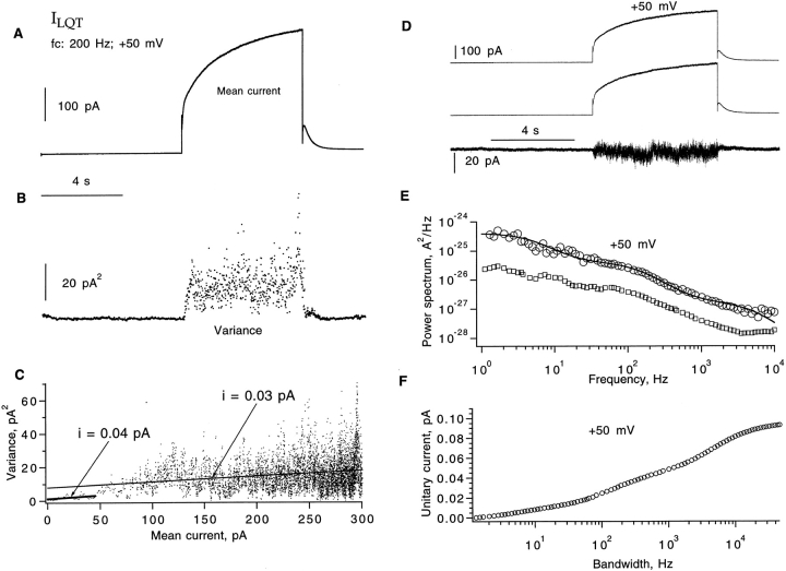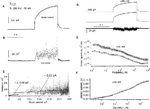 Figure 5. Fluctuation analysis of ILQT. (A) Ensemble mean current was calculated from pairs of sweeps from a total of 10 sweeps, obtained in a giant cell-attached patch recording from an oocyte injected with KvLQT1 RNA alone. Currents were induced by depolarizing pulses to +50 mV from a −80-mV holding potential and repolarized to −60 mV. Data were filtered at 200 Hz. (B) Time course of variance. (C) Variance–mean plot. A linear fit for the current range <50 pA yields unitary current iv = 0.04 pA; iv = 0.03 pA from a linear fit to the entire current range. (D) A pair of aligned current traces and the subtracted current trace filtered at 1 kHz. Same data as in A. (E) Power spectrum calculated from subtracted currents after background noise subtraction. Solid curve is the sum of three Lorentzians with corner frequencies 5, 141, and 5,000 Hz and amplitudes 3.6 · 10−25, 3.7 · 10−26 and 1.6 · 10−27 A2/Hz, respectively. The corresponding mean current was 240 pA, and the estimated single-channel current is = 0.09 pA at 20 kHz. The bottom trace is the spectrum from another recording, displaced downward by one decade for clarity. The mean current in this case was 370 pA and is(20 kHz) = 0.08 pA. (F) Unitary current is was calculated from the integral of the power spectrum; points beyond 10 kHz were computed from the fitted function. In the patch recording, the bath solution was 93 mM K-aspartate, 7 mM KCl, 1 mM EGTA, 10 HEPES, pH 7.4; the pipette solution contained 100 mM NaCl, 1 mM MgCl2, 0.1 mM CaCl2, 5 mM HEPES. |