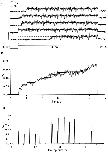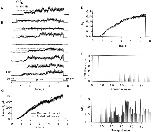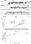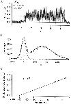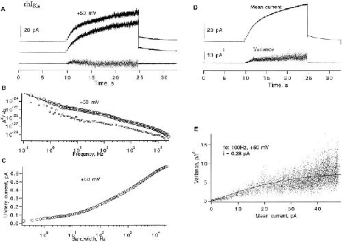 Figure 6. Fluctuation analysis of rhIKs currents. (A) A pair of successive current traces, filtered at 1 kHz. The current was induced by +50-mV depolarizing pulses from −80-mV holding potential, and repolarized to –60 mV in a cell-attached patch recording with 140 mM K-aspartate, 1 mM EGTA, 10 mM HEPES, pH 7.4 in the bath; 96 mM NaCl, 2 mM KCl, 1 mM MgCl2, 0.1 mM CaCl2, 5 mM HEPES in the pipette. Pulses were delivered every 33 s; mean current during the depolarizing pulse was 34 pA. (B) The corrected power spectrum of currents, computed from 36 traces. The solid curve is a fitted power-law function plus four Lorentzian components, of the form S = 1.1 · 10−29 + 6.1 · 10−25/f 1.2 + 6 · 10−26/[1 + (f/11)2] + 2.9 · 10−27/[1 + (f/141)2] + 2.2 · 10−27/[1 + (f/1,195)2] + 8.8 · 10−28/[1 + (f/3,535)2], where f is in Hz and S is in A2/Hz. The unitary current is = 0.67 pA at 20 kHz bandwidth. The lower trace is the spectrum from another recording in which the mean current was 7 pA and is = 0.51 pA at 20 kHz. (C) Frequency dependence of unitary current calculated from the numeric integral of power spectrum over the frequency range 0.1 Hz–20 kHz. (D) Ensemble mean current and variance, from the same data filtered at 100 Hz. The variance trace was calculated from pairs of sweeps to minimize error due to drift. (E) Mean–variance plot. Superimposed is a parabolic fit, which yields the unitary current estimate iv = 0.28 pA. |
