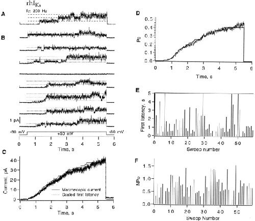 Figure 7. A three-channel, inside-out patch recording from rhIKs channels. (A) A trace with three channels opening during +50-mV depolarization. (B) Eight successive sweeps from the same patch, showing long first latencies in response to depolarizations to +50 mV from the −80-mV holding potential. Pulses were delivered every 8 s. Data were filtered at 200 Hz. (C) Comparison of the time course of the rhIKs macroscopic current seen in another patch (noisy trace) and the first latency function at +50 mV. (D) The ensemble mean time courses of open probability at 50 mV obtained from 60 sweeps. The open probability at the end of the 5-s depolarization was ∼0.5. The superimposed step-wise curve is the first-latency distribution F1 scaled by the factor 0.8. It was computed according to where F3 is the observed first-latency distribution from 60 sweeps recorded from the three-channel patch. (E) Diary plot of the three-channel first latency F3 in the patch recording. Latency values of 5 s correspond to the case in which no channel opens. (F) Diary plot of the time-averaged open probability from this patch. For this recording, the bath solution was 130 mM K-aspartate, 10 mM KCl, 1 mM EGTA, 10 mM HEPES, pH 7.4; the pipette solution was 100 mM NaCl, 0.2 mM KCl, 1 mM MgCl2, 1.8 mM CaCl2, 5 mM HEPES, pH 7.4. |
